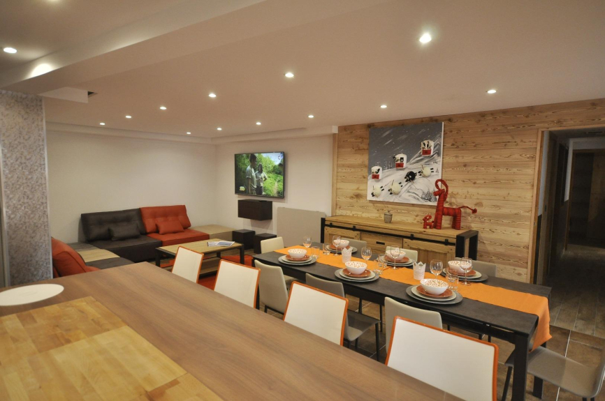 Located on the garden level of the Hinouka chalets, very spacious with its 100 m², illuminated by huge bay windows on the south side, the Kilimandjaro will seduce you with its huge fully equipped kitchen open on the living room, its 4 bedrooms... Ultra-modern interior with some walls made of old country larch, interior windows, skin walls, plush furniture: Fama leather sofa, giant flat screen 163 cms, WI-FI connection... 150 m from the ski lifts and all shops