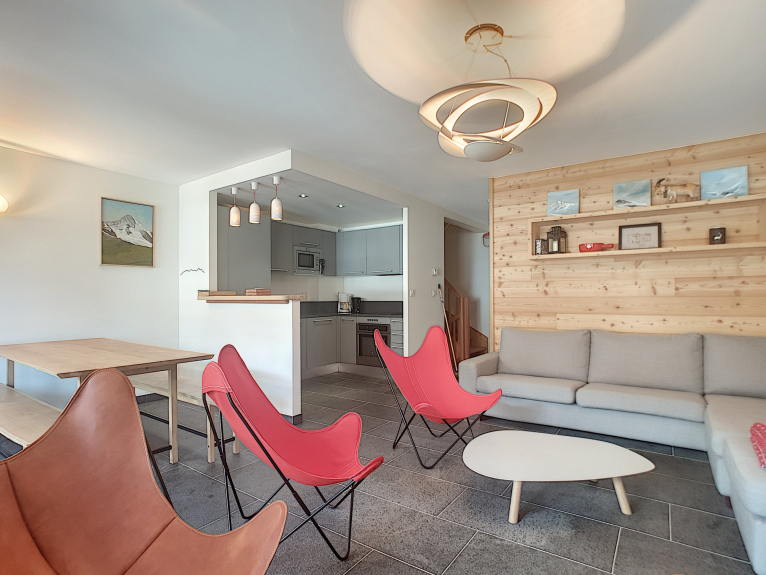Equipment: WIFI, flat screen TV, fridge, oven, microwave, ceramic hob, filter coffee maker, toaster, kettle, vegetable mill, 1 electric plancha, 1 raclette/pierrade machine, Laundry room shared with the other apartment equipped with washing machine, tumble dryer, vacuum cleaner, ski boot dryer, iron and ironing board.