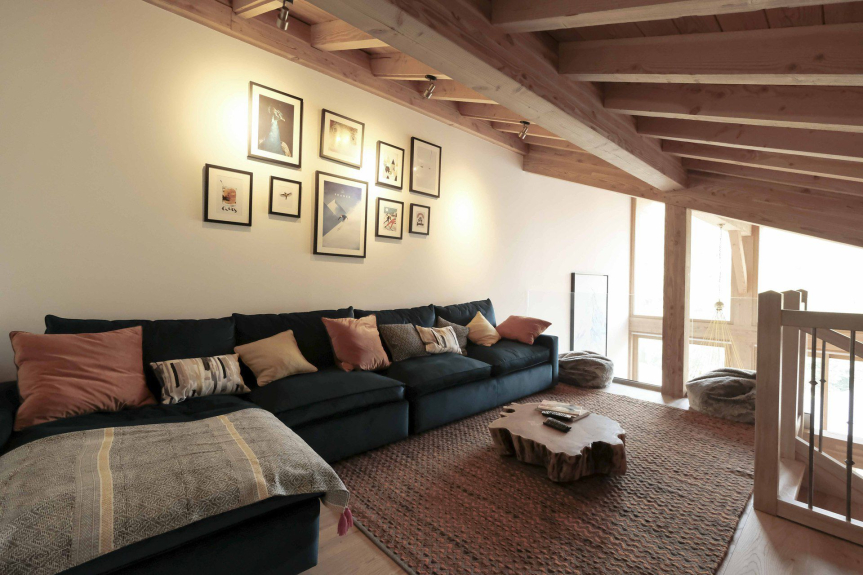 Large open plan seating and dining area with great picture windows that look out across the village to the mountains and across a large terrace. Outside on the private sun terrace, this undercover area has seating and a large luxury hot tub to help you unwind after a day on the slopes.