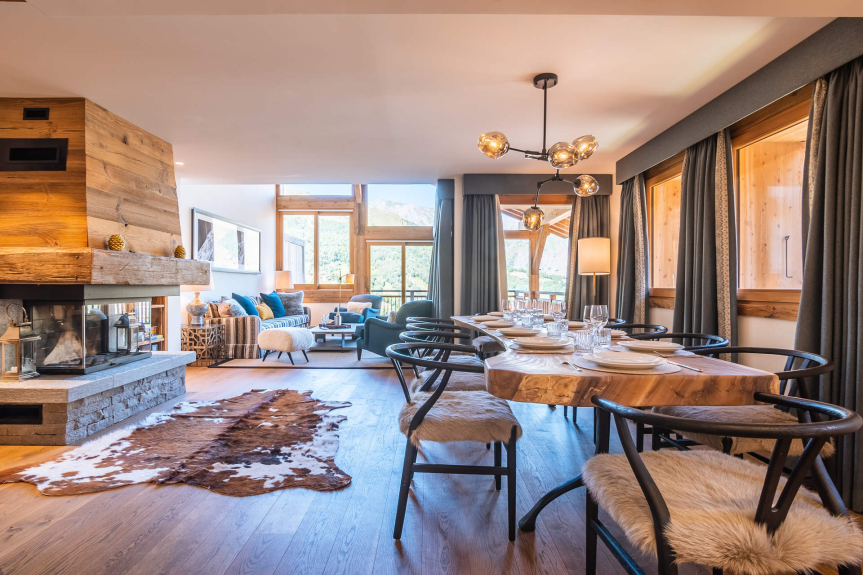 Spacious and warmly furnished, this high-end alpine-style chalet offers a large terrace with stunning views upon the mountain range.