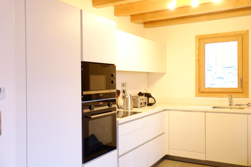 Fully equipped kitchen with induction hob, dishwasher, oven, microwave, kettle, toaster and electric coffee maker.