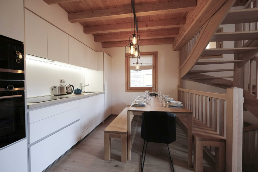 Fully equipped kitchen with dining area: induction hob, dishwasher, oven, microwave, kettle, toaster and french press
