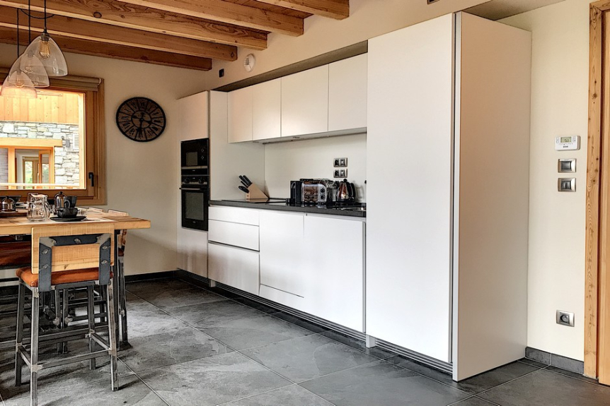 Fully equipped kitchen: induction hob, dishwasher, oven, microwave, kettle, toaster and electric coffee maker, opening upon the dining and living room.