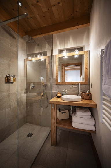 Chalet Celeste has five elegant bedrooms each with direct access to an exterior terrace or balcony with exceptional views over the Alps. Each room is also equipped with quality linen, 46" TV, integrated cupboard and an en-suite bathroom. The wellness centre includes a spacious 8 seater indoor Jacuzzi, a 6 seater sauna and a shower. The heated ski room is also conveniently located slope side for direct access to the ski runs. Chalet Celeste top floor, with it's impressive architecture, hosts a generous living space with a fitted kitchen, a dining space, a sitting room and a centrally suspended and rotating chimney. The covered exterior terrace includes a table for 15 people and a lounge corner. Chalet Celeste also includes a garage with 2 parking spaces conveniently connected on the same level to the living space.