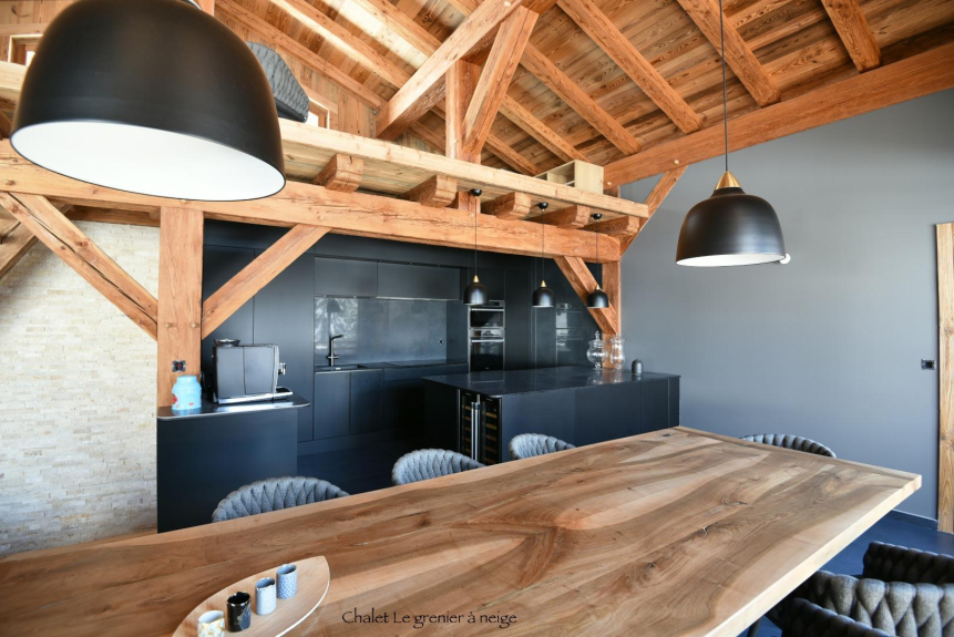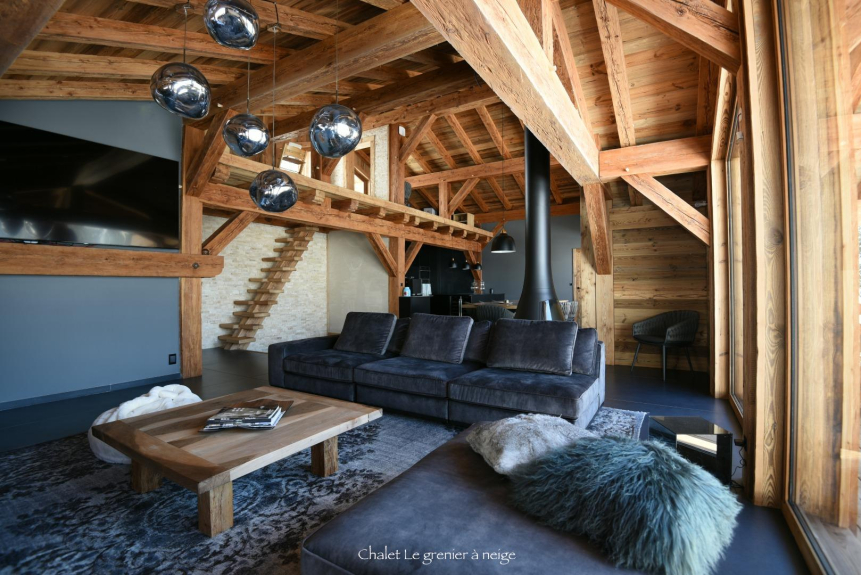 Le Grenier à Neige is a top of the range chalet where every detail has been taken care of, from the building materials to the decoration. The roof is made of tavaillons (old fashioned red cedar wood tiles). Inside, you will find the same materials such as wood and stone, bringing authenticity and warmth, but without forgetting modern comfort.