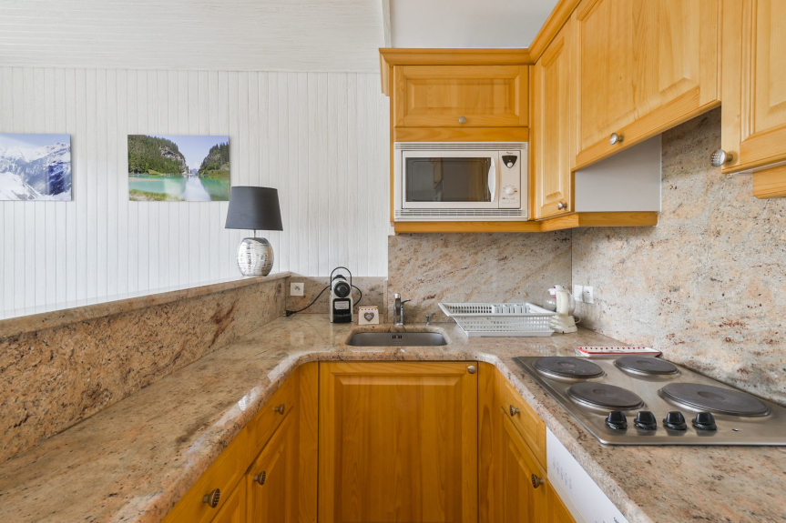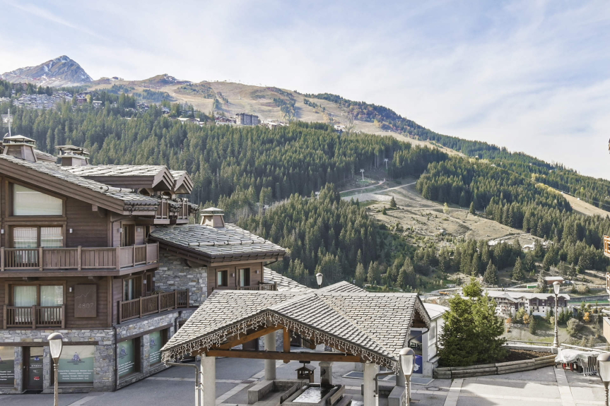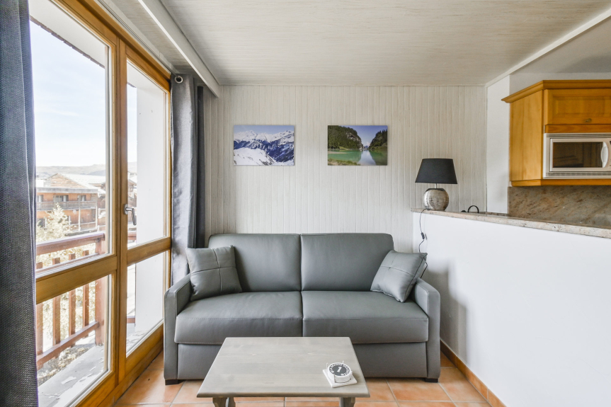 Living-area with bay windows leading to a small balcony exposed North-West with view on the mountains and on the ski slopes.
