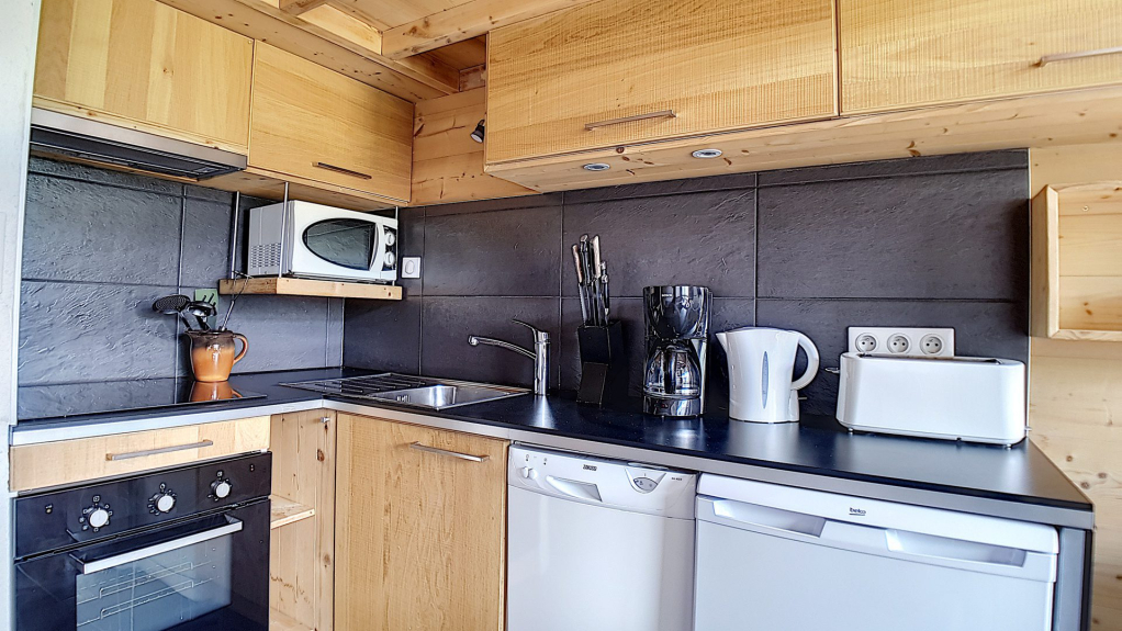 Kitchen equipped with 2 electric plates, a refrigerator, a traditional oven and a microwave, dishwasher, coffee maker, toaster and kettle.