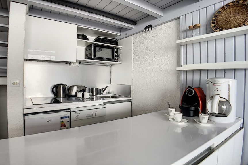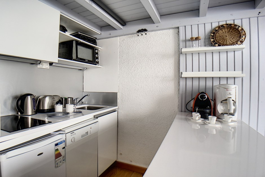 Built-in kitchen with 2 ceramic hobs, mini oven, refrigerator, dishwasher, toaster, kettle and coffee machine.