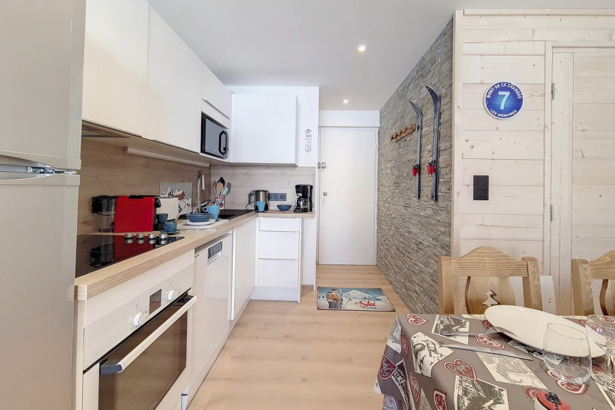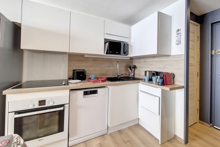 Kitchen equipped with 4 ceramic hobs, refrigerator, dishwasher, microwave, mini-oven, coffee maker and kettle.