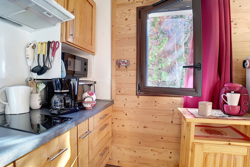 Kitchen equipped with 2 ceramic hobs, refrigerator, dishwasher, electric oven, microwave, raclette machine, fondue set, kettle, classic coffee maker, Tassimo coffee maker and toaster.