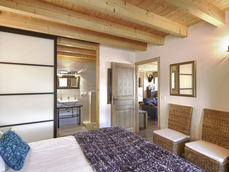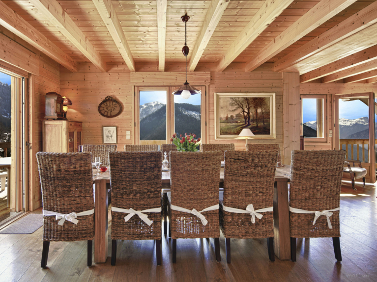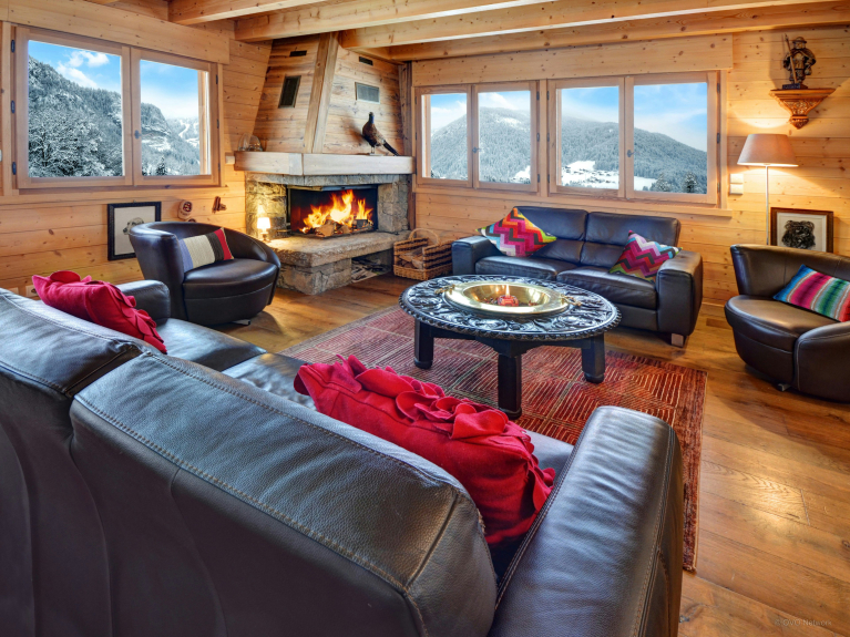 The main living area allows you to share meals around its large table and to exchange impressions of the day around its warm fireplace. Underfloor heating ensures a cosy atmosphere for when you return from the slopes, and in fine weather the patio doors open onto a large terrace where you can watch the sun set over the mountains with a glass of local wine.