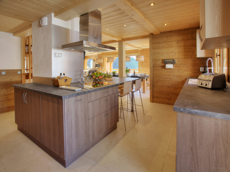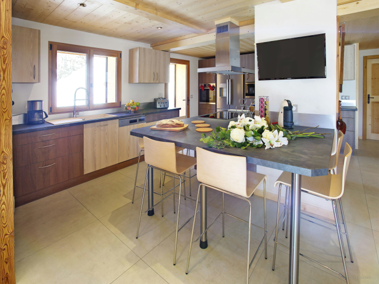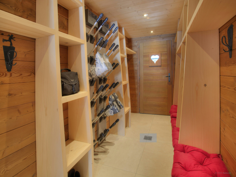 The two lounge areas are equipped with a bar, a dance floor and a comfortable sitting area near the fireplace. The fully equipped kitchen opens onto the dining area, which can accommodate all guests around the table. Large windows open onto the terrace. There is also a shower room on this level and separate toilets on each floor. The ski room has a boot dryer and storage for your equipment. A secure bike shed is available with charging points for electric bikes.
