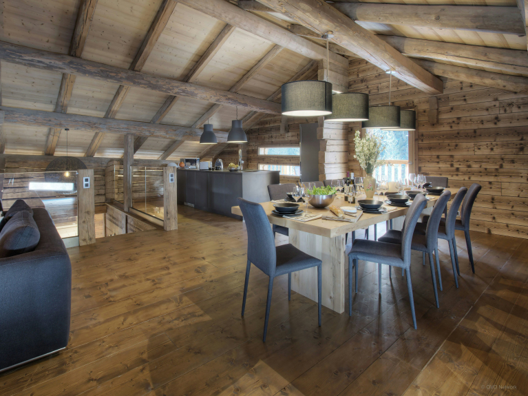 The kitchen island is fully equipped. You will be able to cook for all the guests of the chalet and the large table will allow you to share your meals together. This area has bay windows opening onto the balcony, from where you can admire the view while having an aperitif, for example.