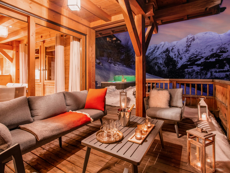 Head upstairs to the L-shaped living area. The kitchen is fully equipped and separated from the dining area by a countertop. The cosy living room has a corner sofa in front of the open fireplace. In the evening, you will enjoy being in this room to reminisce about your day and plan the next one. The terrace is an excellent vantage point for stargazing. There is another cosy sitting area with blankets for the winter and deckchairs for the summer. A dining area allows you to eat outside on sunny days. In summer and winter alike, the jacuzzi remains a favourite place to relax.
