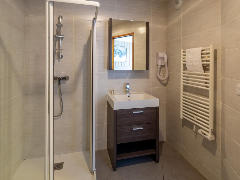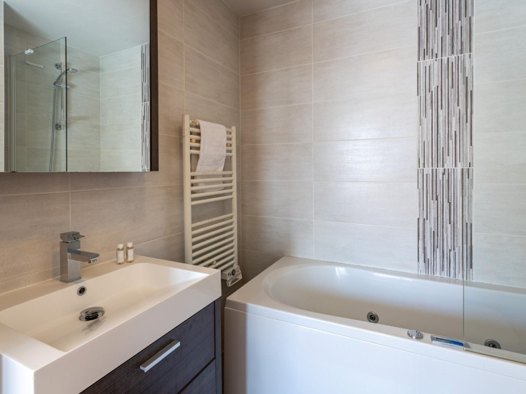 The attractive living room can comfortably seat up to 6 people, Smart TV and access to a balcony. The fully equipped open-plan kitchen-diner has excellent appliances that will allow the preparing of great dinners for lovely evenings around the dining table complete with 6 seating chairs. All bedrooms in the chalet are en suite and have their own hairdryers.