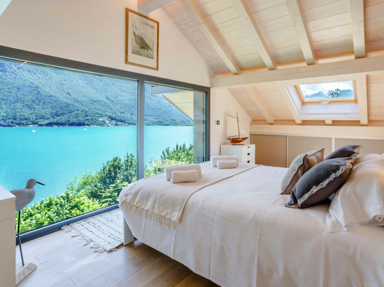 At the moment the chimney is not in working order. Please note the size of the beds: 2 double beds 140x200, 1 double bed 160x200, and 2 single beds 90x200 which can be combined into 1 double bed 180x200. The road bordering Lake Annecy passes below the property.