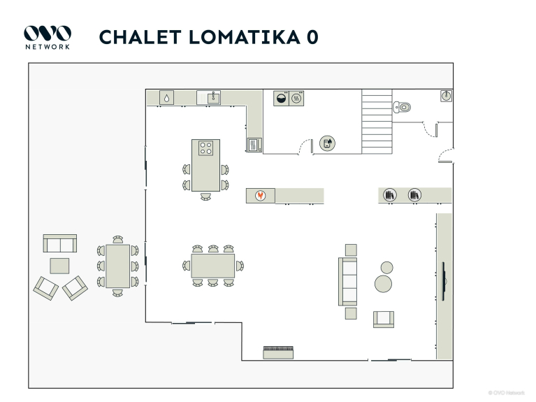 On the ground floor, the large living area consists of a bright lounge with cream coloured sofas and armchairs in front of the TV. Thanks to the central fireplace, the house will be very warm even in the coldest weather. Make yourself comfortable with a book from the library or gather around the piano to sing along.