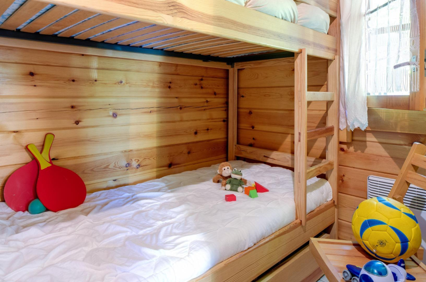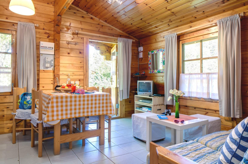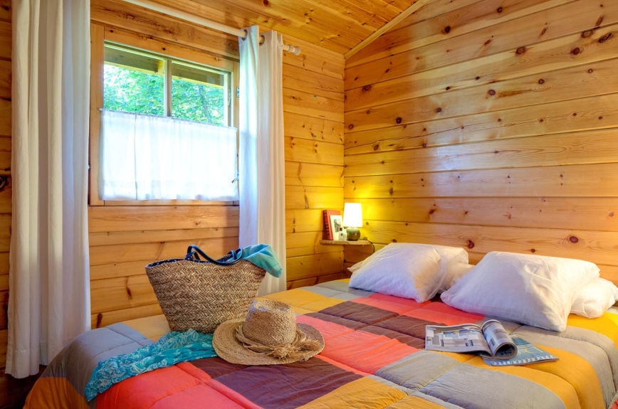 Bleuet: holidays cottage per a 4 people, in the campsite L'Escapade (Estavar, Occitanie). Living-room with kitchenette, 2 bedrooms, bathroom. TV, wi-fi acces. Pet under conditions.
