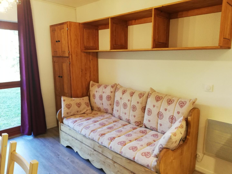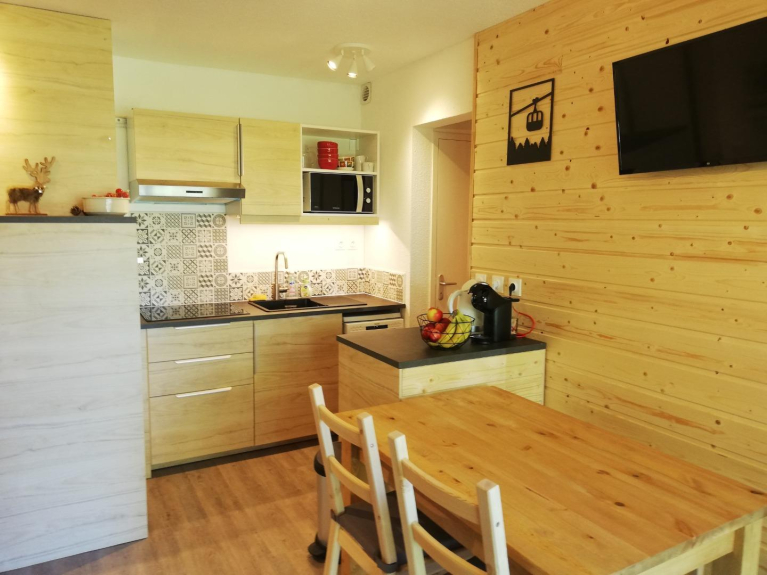 - a living room with a fully equipped kitchen (oven, induction hob, microwave, dishwasher, fridge and freezer), washing machine, TV, pull-out sofa (2 quality beds 80 x 190) and all small appliances (coffee machine, fondue and raclette machines...)