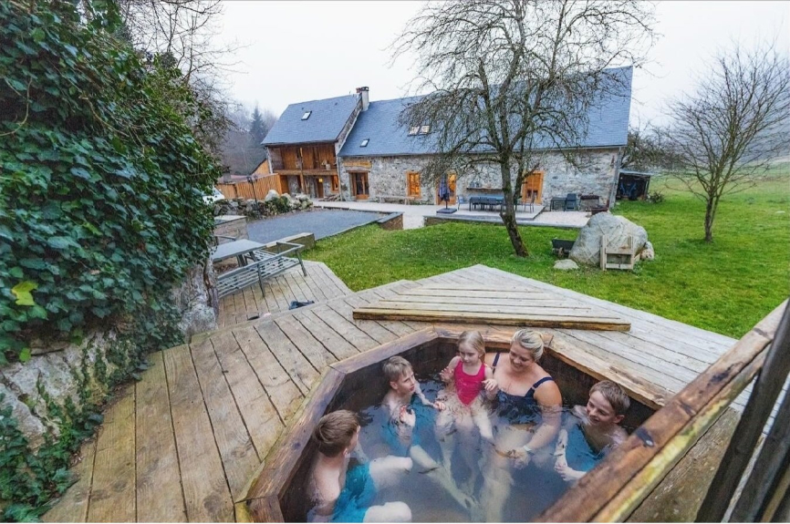 Finnish bath (jacuzzi heated with wood + electric) usable in summer and winter.
