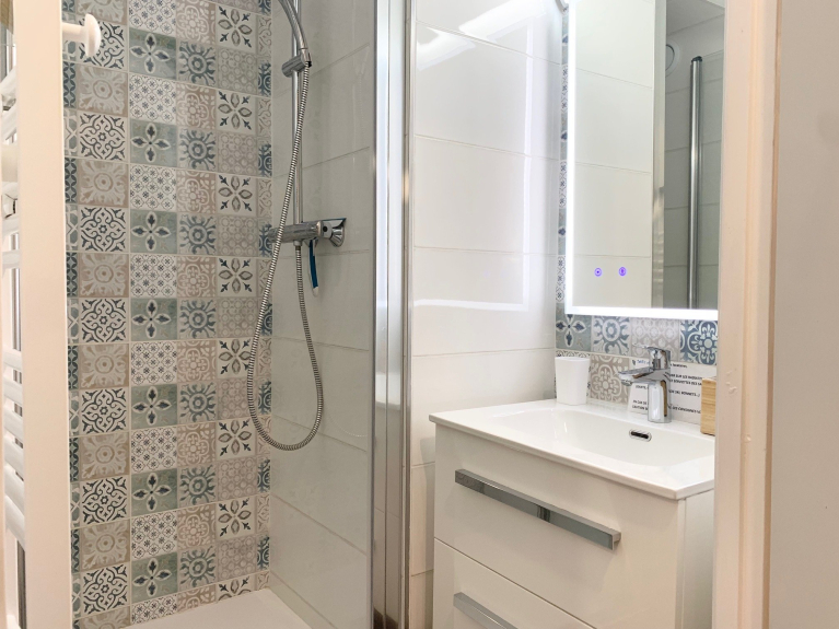 Kitchen open to living room with double sofa bed, one double bedroom and one twin bedroom. One bathroom, one shower room. Separate toilet. Ski locker.