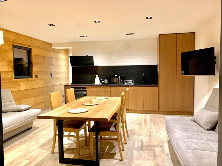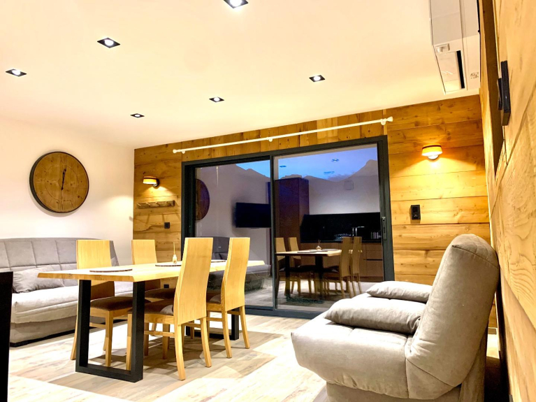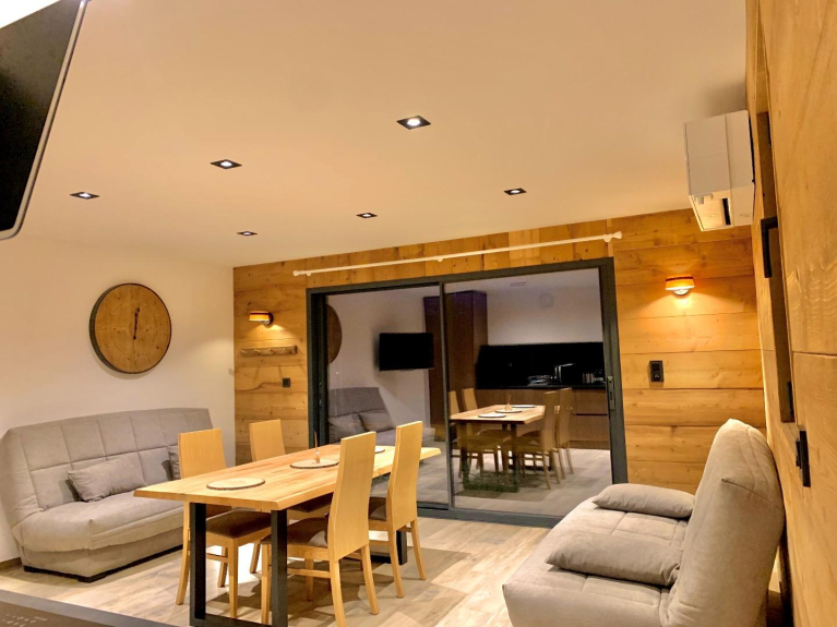 Hello. La Joue du Loup is a beautiful resort, very pleasant and family which is at 1600 of altitude. In the station you will find restaurants, grocery store, cheese shop, bakery, brewery, a tobacco shop, mini-market, laundry, children's playground ex. The chalet was built in 2021. It is located 250m from the slopes and ski lifts and 100m from the wellness center (Odyssea) Swimming pool, sauna, balneo, massage ext. The t2 is located in the ground floor of the chalet, the entrance is independent. You have a bedroom with a double bed equipped with a wardrobe, a bathroom equipped with a towel dryer, living room with fully equipped kitchen, 2 double sofa beds, TV and wifi.