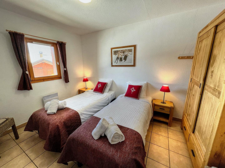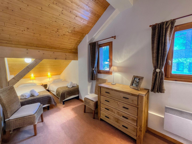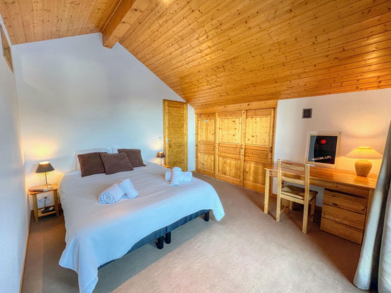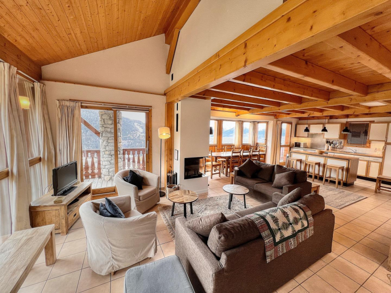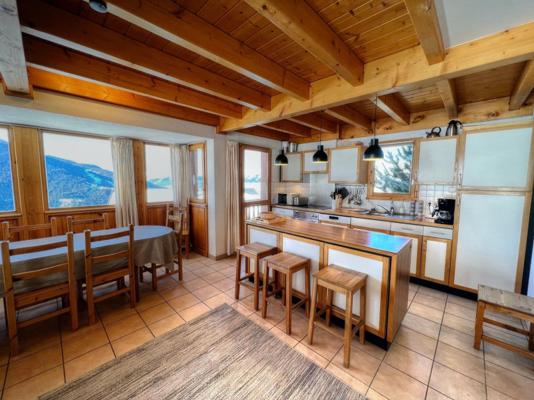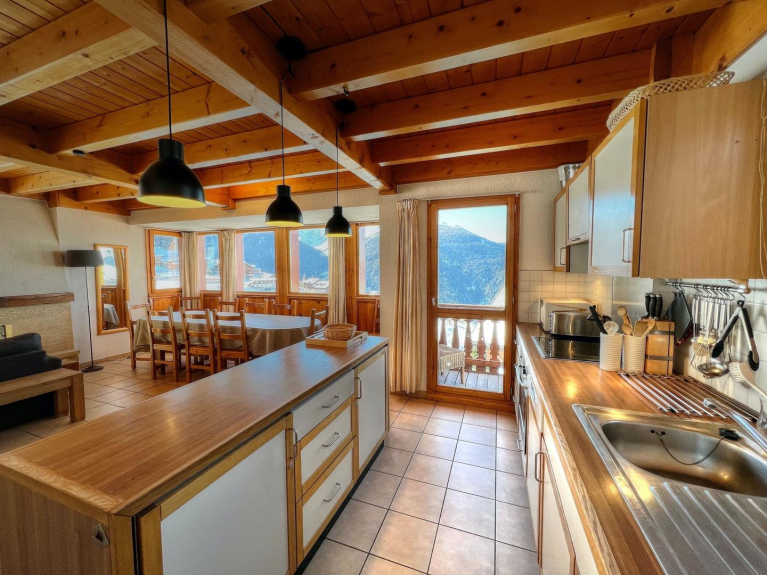The large open plan living area has floor to ceiling windows overlooking the piste and down to Vallandry. The lounge area has an open fire for cozy evenings on the new sofas. The kitchen is fully equipped for self-catering or in-house catering can be arranged. The chalet has electric underfloor heating and wall heaters so is always nice and cosy. Large ski lockers are situated next to the front door for safe storage of all equipment.