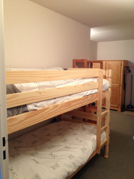 38M² with a large living room-kitchenette, 2 bunk beds, west facing bedroom, bathroom and separate toilet,