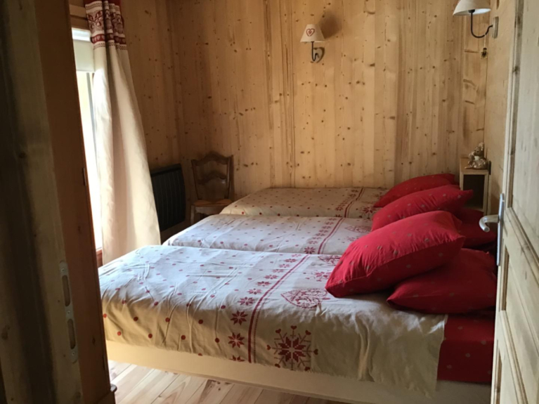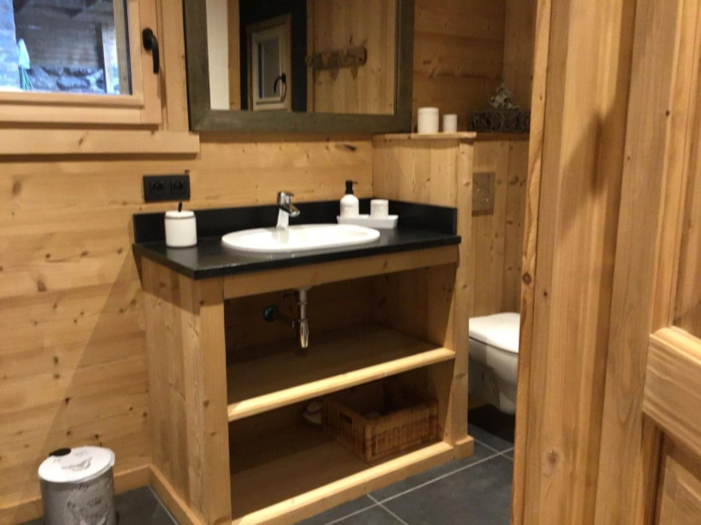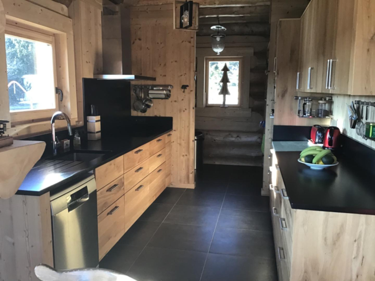 The chalet is composed of an entrance hall with a checkroom and an independent toilet with hand wash basin, a well-equipped kitchen, a storeroom and a living/dining room opening onto the terrace.