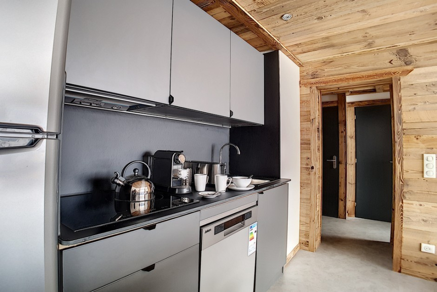 Equipped kitchen: a refrigerator, 3 induction plates, oven, microwave oven, dishwasher, electric coffee maker.