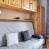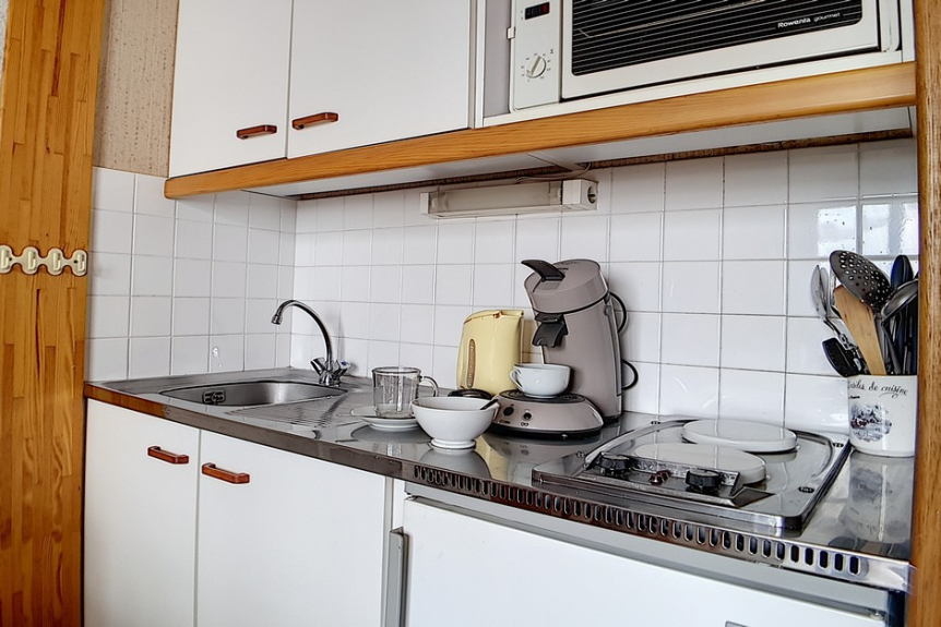 Kitchen with 2 hotplates, fridge, oven, microwave oven, electric coffee maker, kettle and SENSEO coffee maker.