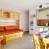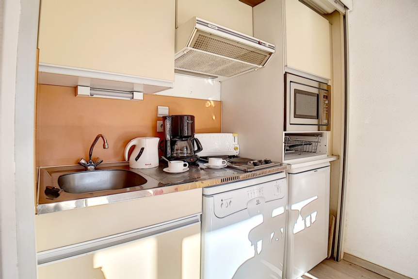 Kitchen equipped with 2 electric plates, refrigerator, microwave, dishwasher, coffee maker, kettle and toaster.