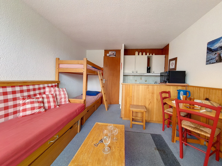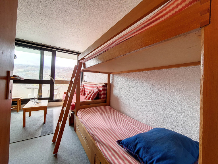 Bright 19m² studio with a magnificent view of the mountain range. West facing balcony, equipped for 3 people. Private ski locker. 15th floor with elevator.