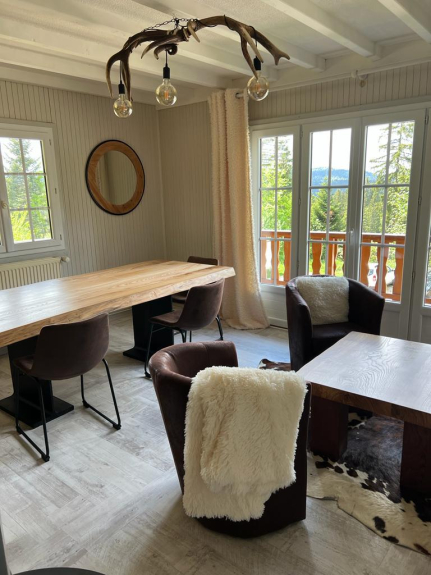 On the first floor a large living room of 18 m2, warm atmosphere, mountain with a large table, corner aperitif with sofa, armchairs, coffee table, TV flat screen (TV orange, wii u, wifi) a large bay window giving on the balcony of 20 m2 (making the turn of the chalet on 2 faces), allowing pleasant sight and to benefit from the sun.