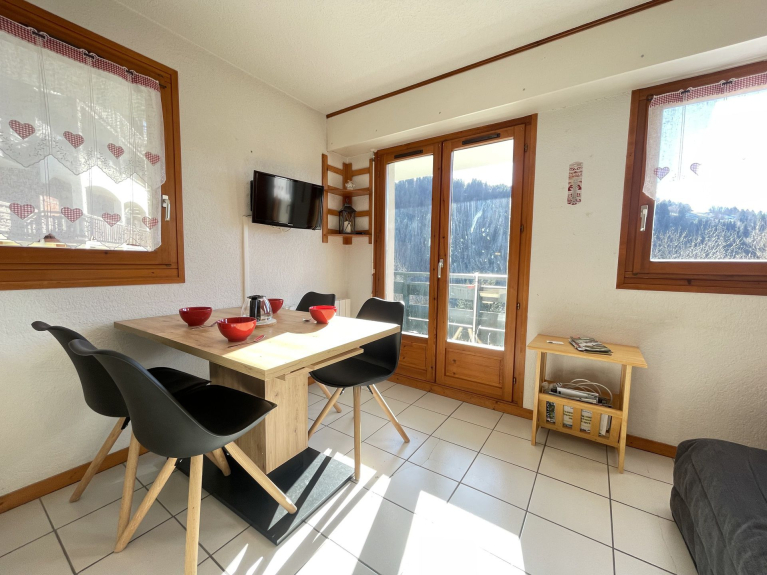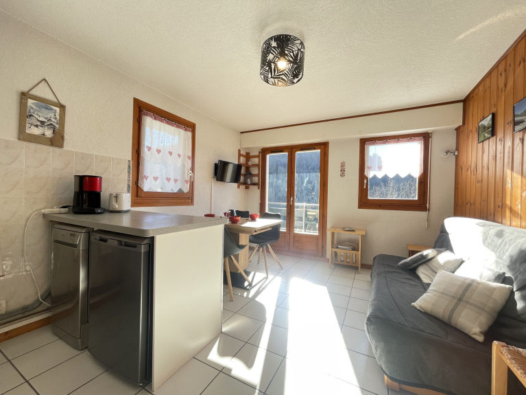Quiet apartment, in the authentic village of Notre Dame de Bellecombe. Surface of 35m ², ideal for four people, it is located on the ground floor of the residence with a balcony facing south offering beautiful views of Mount Charvin and the valley. Located close to the leisure area, next to the ski bus stop and less than 5 minutes walk from shops and restaurants.