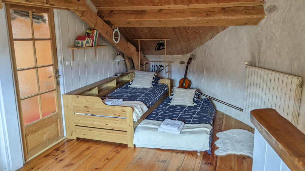 - on the second floor, a large room with a double bed and a sofa that can be transformed into two trundle beds, a room with a desk and two single beds and a shower room with WC. Both rooms have an air conditioning fan. Possibility on request to add a BABY BED