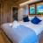 The accommodation is spread over three levels, with the living room on the middle floor and the bedrooms distributed over the other floors. This is a perfect arrangement for groups composed of two families, who can allocate one floor each. Three very spacious rooms have a double bed and a private bathroom. Another room has three single beds and an en suite shower room. And the last room offers bunk beds for five with a bathroom right across the hall.