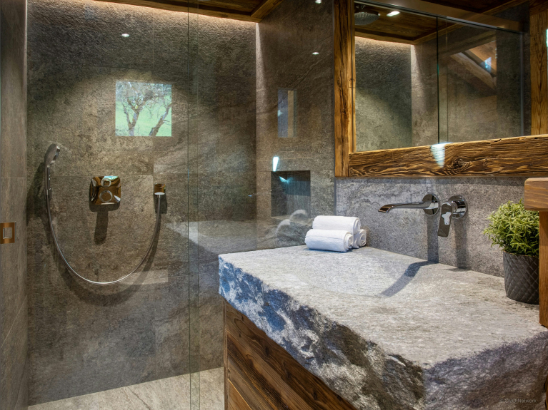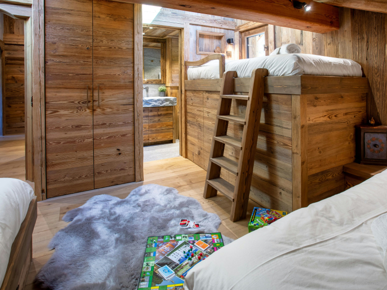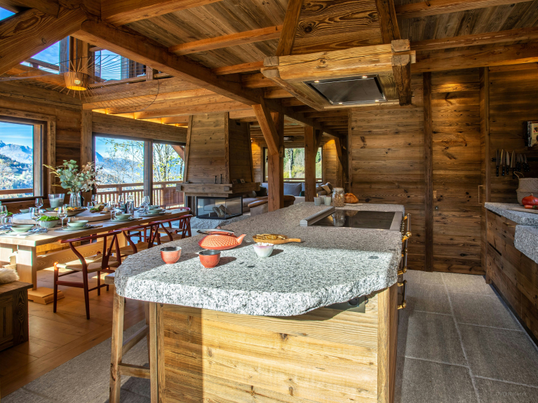 The large living room on the central floor opens onto a magnificent furnished panoramic terrace, where the view stretches over the valley to Mont Blanc. The modern kitchen includes a large stove, two refrigerators and two dishwashers, so that cooking is always a pleasure, even for large groups. There is plenty of room to eat together at the large dining table, or out on the terrace to enjoy the fresh alpine air.