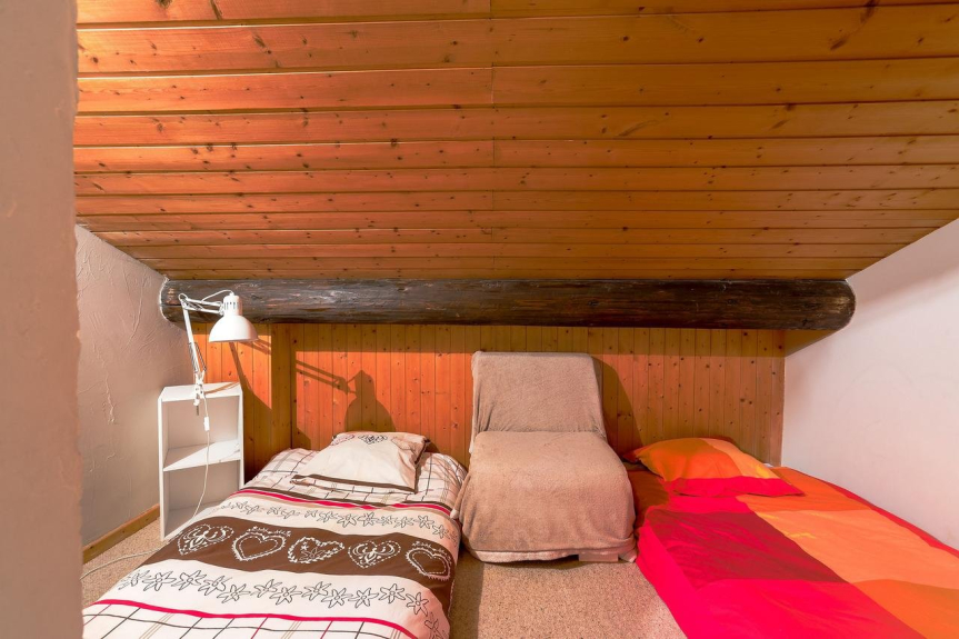 • 2 communicating double rooms (1 double bed and 2 single beds) accessible by a ladder in an attic space.