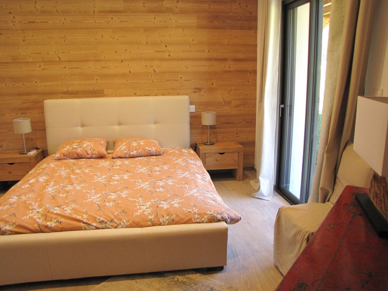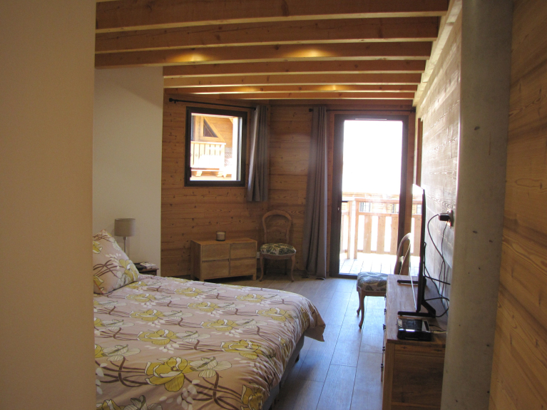 A master bedroom (160x200 bed) with en-suite shower room, walk-in shower and private wc opens onto the terrace that surrounds the chalet.
