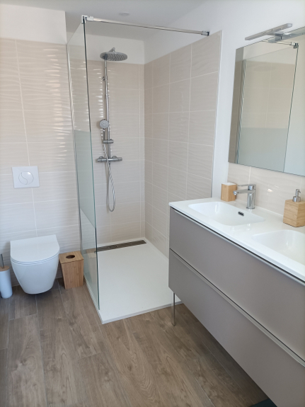 On the garden level, there are 3 double bedrooms (160 x200 beds), 2 with en-suite shower rooms and toilets, and 1 with TV,