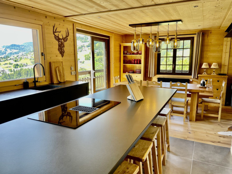 facing west, with a beautiful terrace. With its cosy atmosphere, this chalet is perfect for your next vacation, accommodating 8 to 10 people.