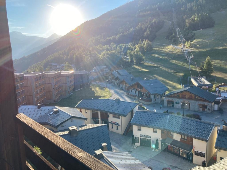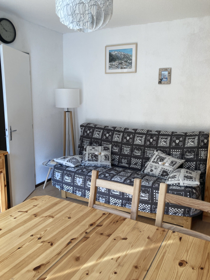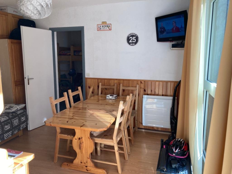 Apartment facing the slopes in the heart of the resort, fully equipped, top floor, south-facing, balcony. Single bedroom with 140/190 bed, sleeping area with 2 x 90/190 bunk beds, bathroom with shower cubicle, separate toilet, fully equipped kitchen with oven, microwave, coffee maker, Nespresso coffee machine, kettle, fridge, dishwasher, dining room with sofa bed, flat-screen TV, ski locker, free outdoor parking or free covered parking.
