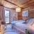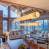 Large living room with fireplace and dining area, surrounded by a balcony on two sides.