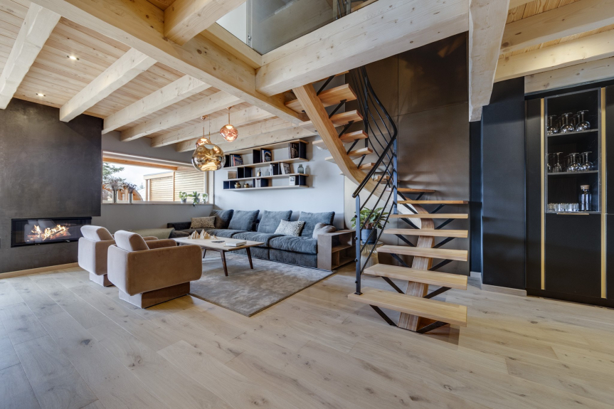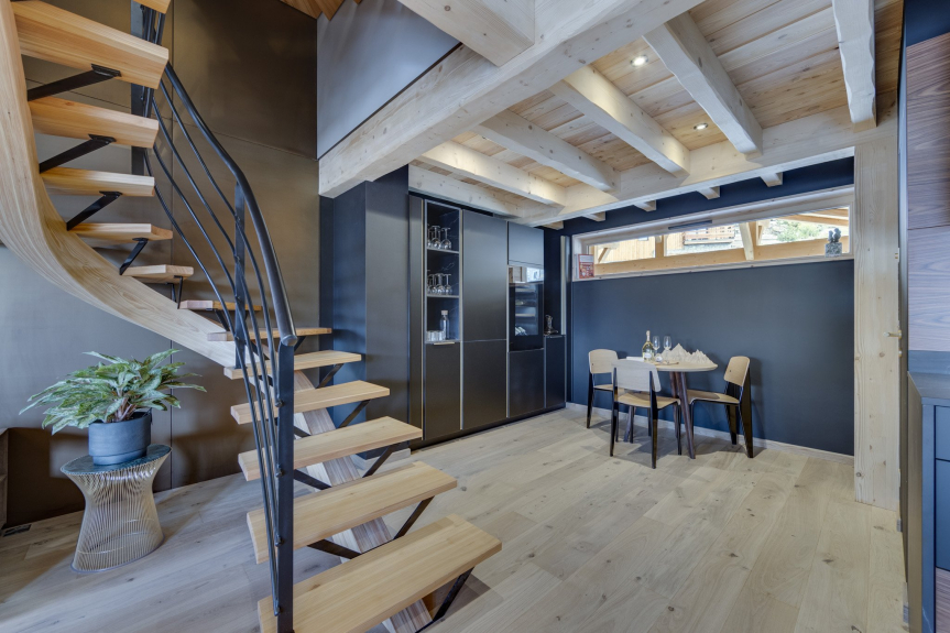 In keeping with the contemporary spirit of Les Arcs' innovative architecture, the Bela Vya 2 chalet radiates a soft, soothing ambience. Its blond wood and natural tones give way to a fabulous panoramic view of Mont Blanc, which, thanks to the large windows, can be enjoyed from the inside.