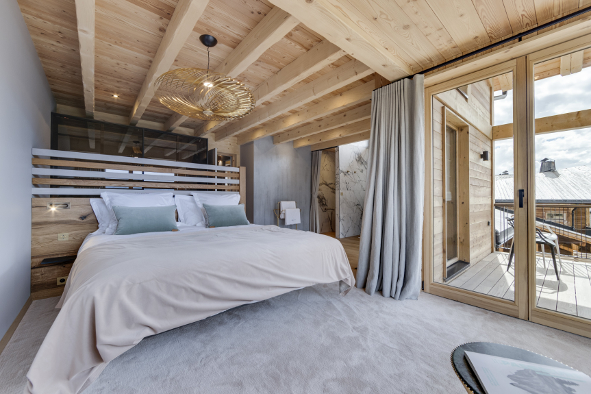 Comprising 5 bedrooms, all with en suite shower rooms. The large master bedroom, nestled on the top level of the chalet, adds a small living room, office area, bathroom with shower and bathtub, and toilet.