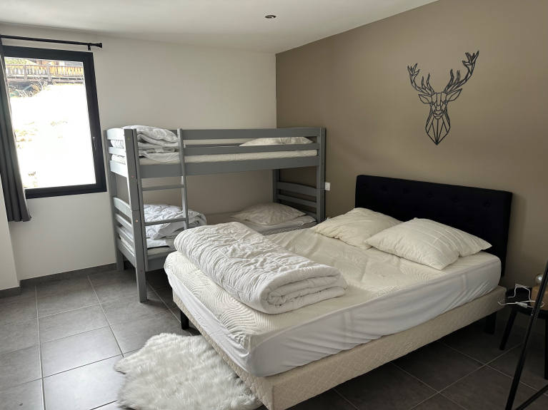 Our two bedrooms are each equipped with a double bed (140) and a bunk bed (90).