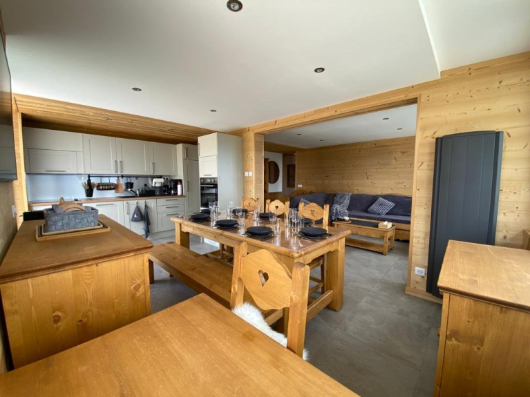 Superb, fully renovated 78 m² (4/5-room) double-exposure apartment, sleeps 9, 3 bedrooms, one with 2.5 m² balcony overlooking Mont-Blanc, 2 bathrooms, 2 WCs, large living room with open-plan kitchen.