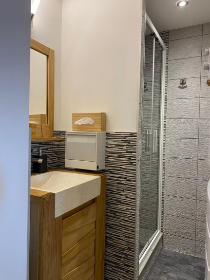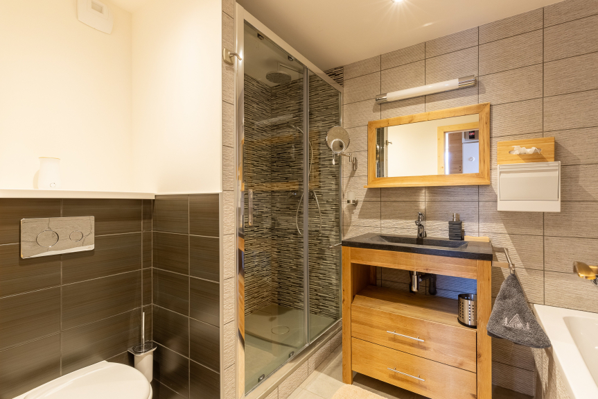Bathroom 2: bath, shower, washbasin, 1 mirror + built-in shelf, electric towel dryer, 2 towel rails (1 wall-mounted + 1 freestanding), 1 hair straightener, wall hooks, bath mat, wall-hung WC + step.
