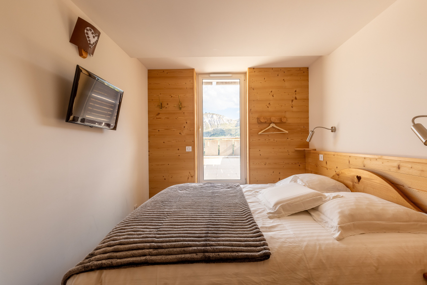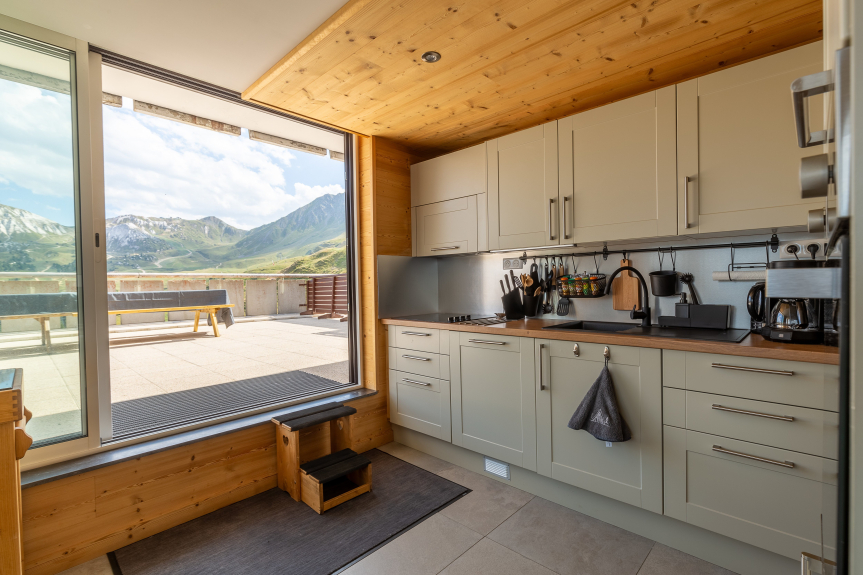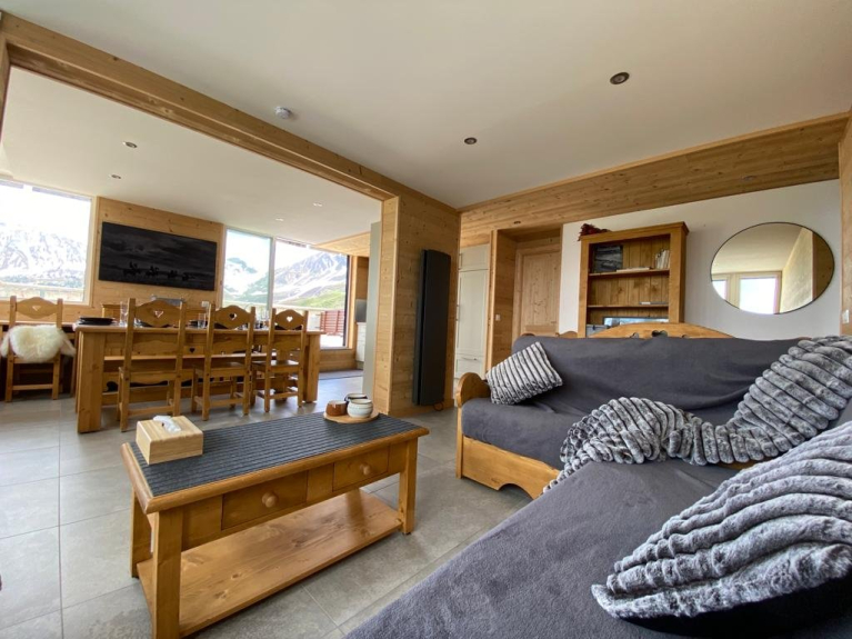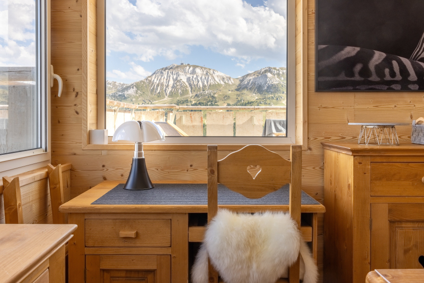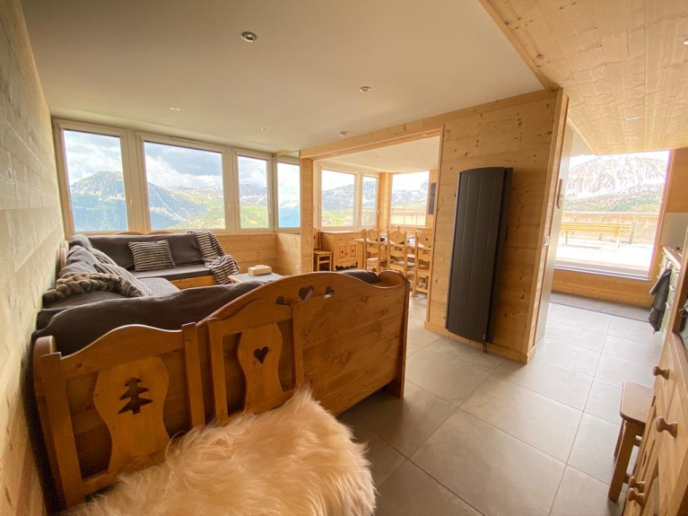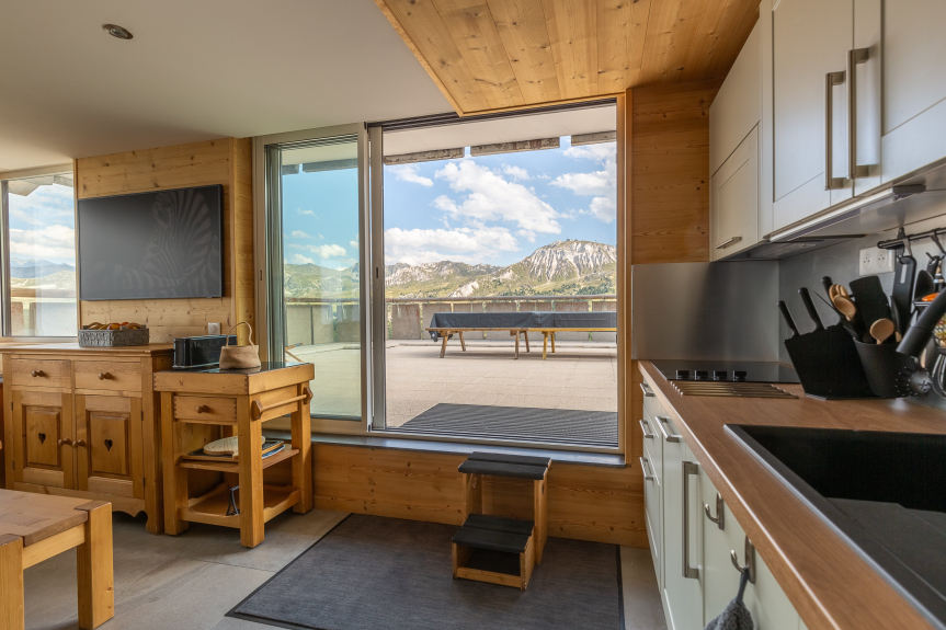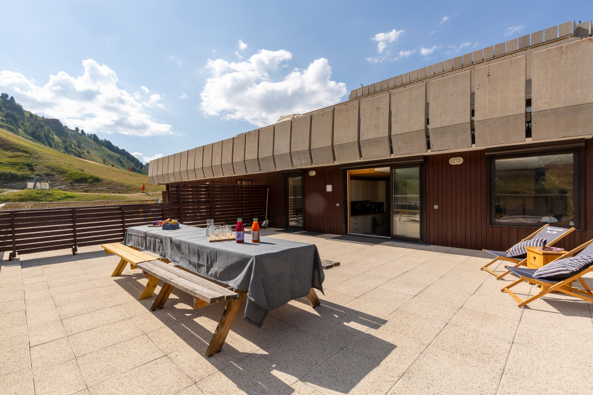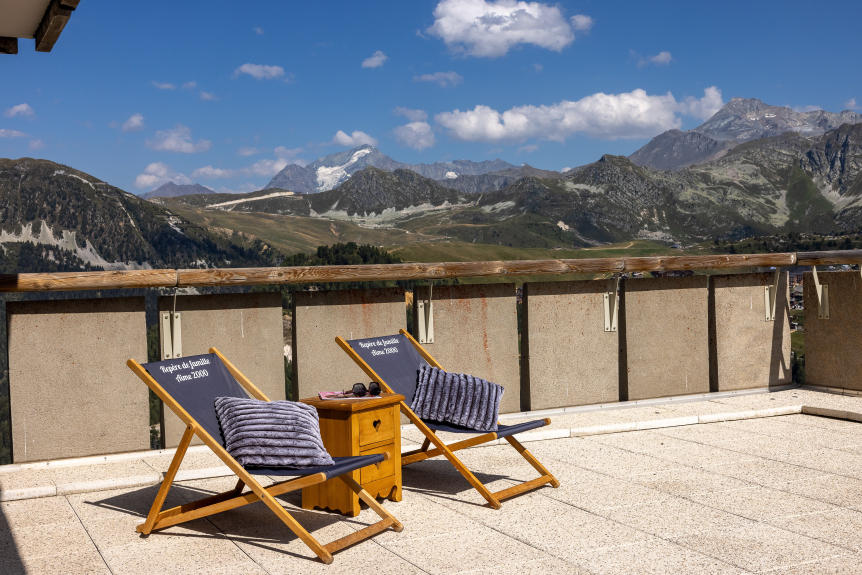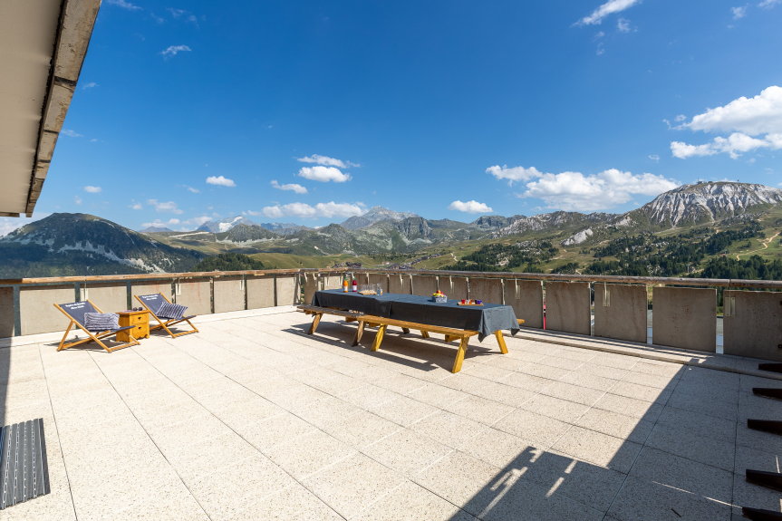 Huge 71 m² terrace with exceptional panoramic view of Mont-Blanc and La Plagne resorts.